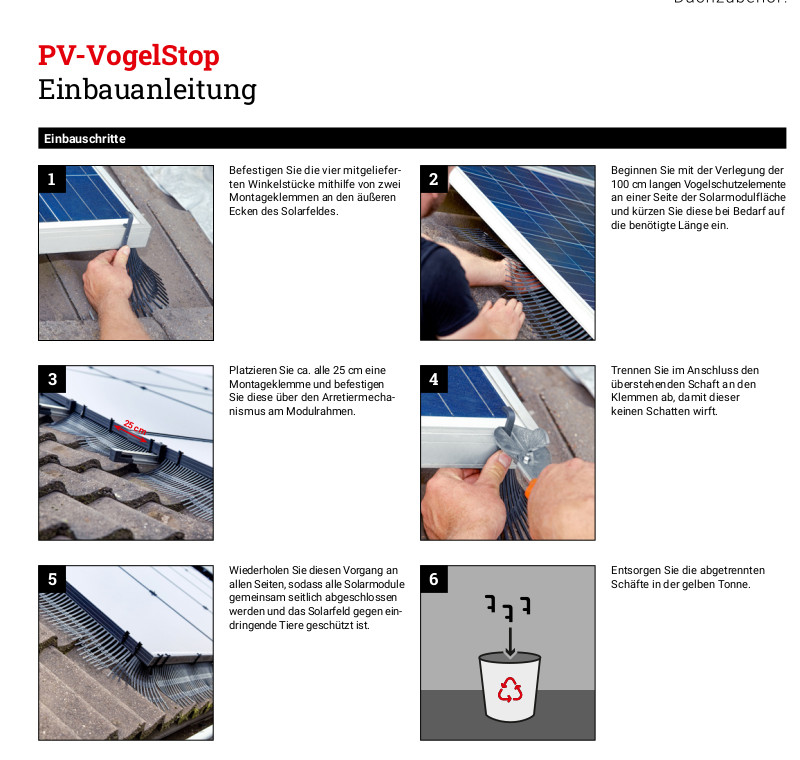 Der PV-Vogel Stop von Fleck ist eine unverzichtbare Investition für jeden Betreiber einer Photovoltaikanlage. Er schützt nicht nur vor potenziellen Schäden, sondern sorgt auch dafür, dass Ihre Solaranlage effizient arbeitet. Schützen Sie Ihre Investition und maximieren Sie den Ertrag Ihrer Solarmodule – mit dem effektiven PV-Vogel Stop von Fleck!